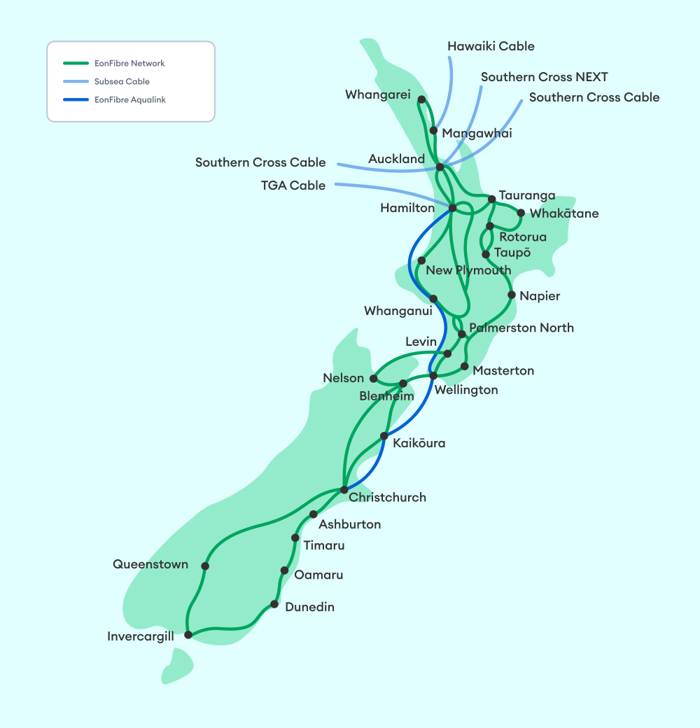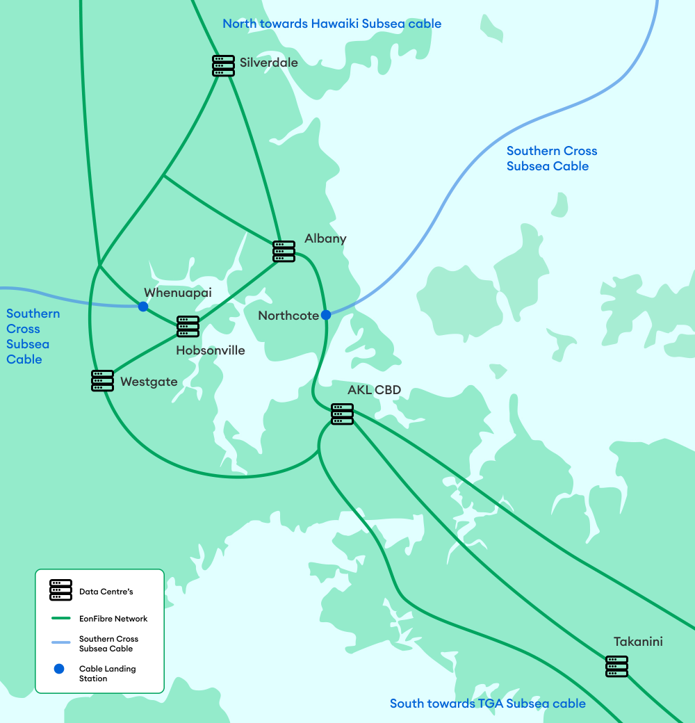 A specific focus on capacity expansion and route diversity in all key cities (Auckland, Hamilton, Wellington, Christchurch), especially in Auckland across the Albany, Westgate, CBD and Silverdale data centre clusters. Utilising the EonFibre national and international network to access data centres is seamless.